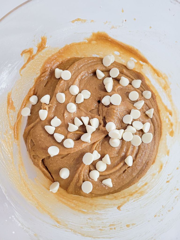 - Add in your white chocolate chips (and other mix-ins) and mix some more. The batter should be thick and stick to the spatula or spoon.