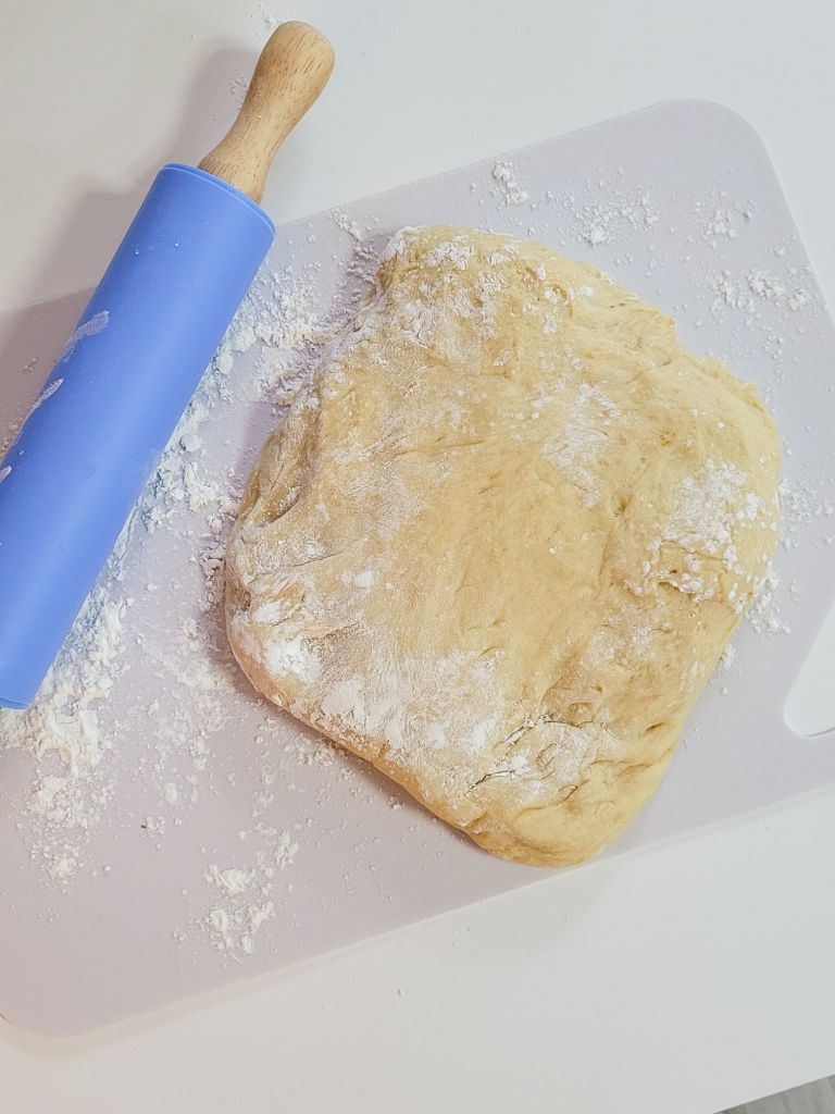 - Once the dough is finished rising in the breadmaker (about 90 minutes), place it on a lightly floured surface, and roll it out into a thin rectangle.